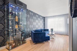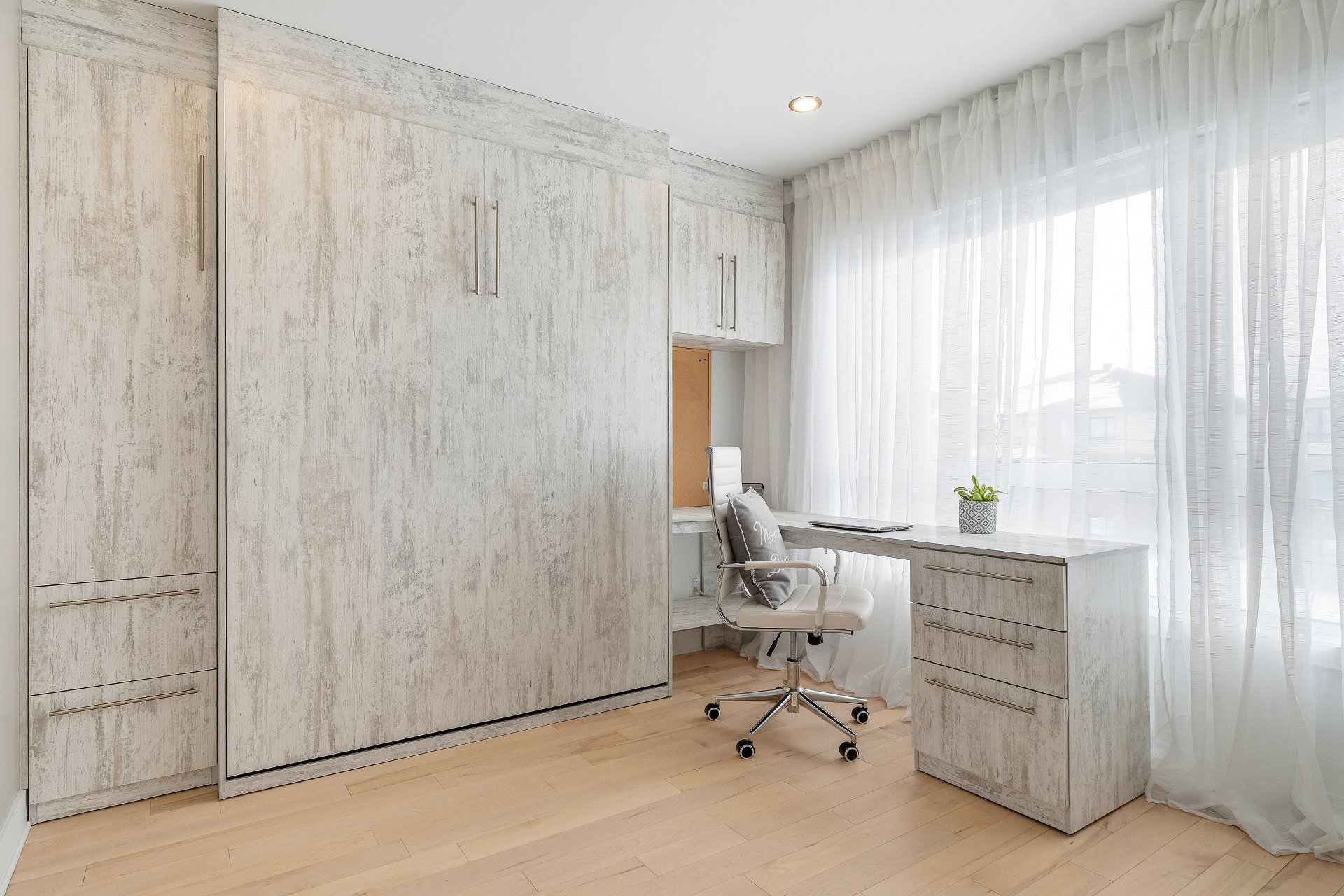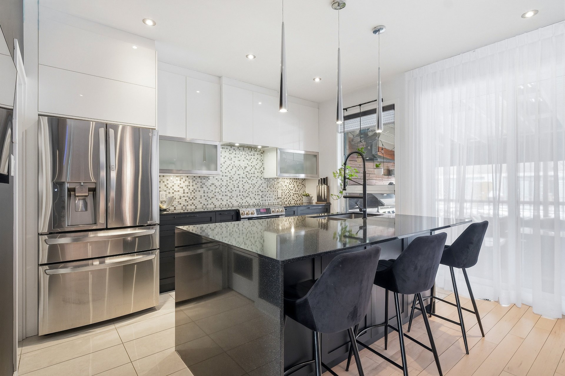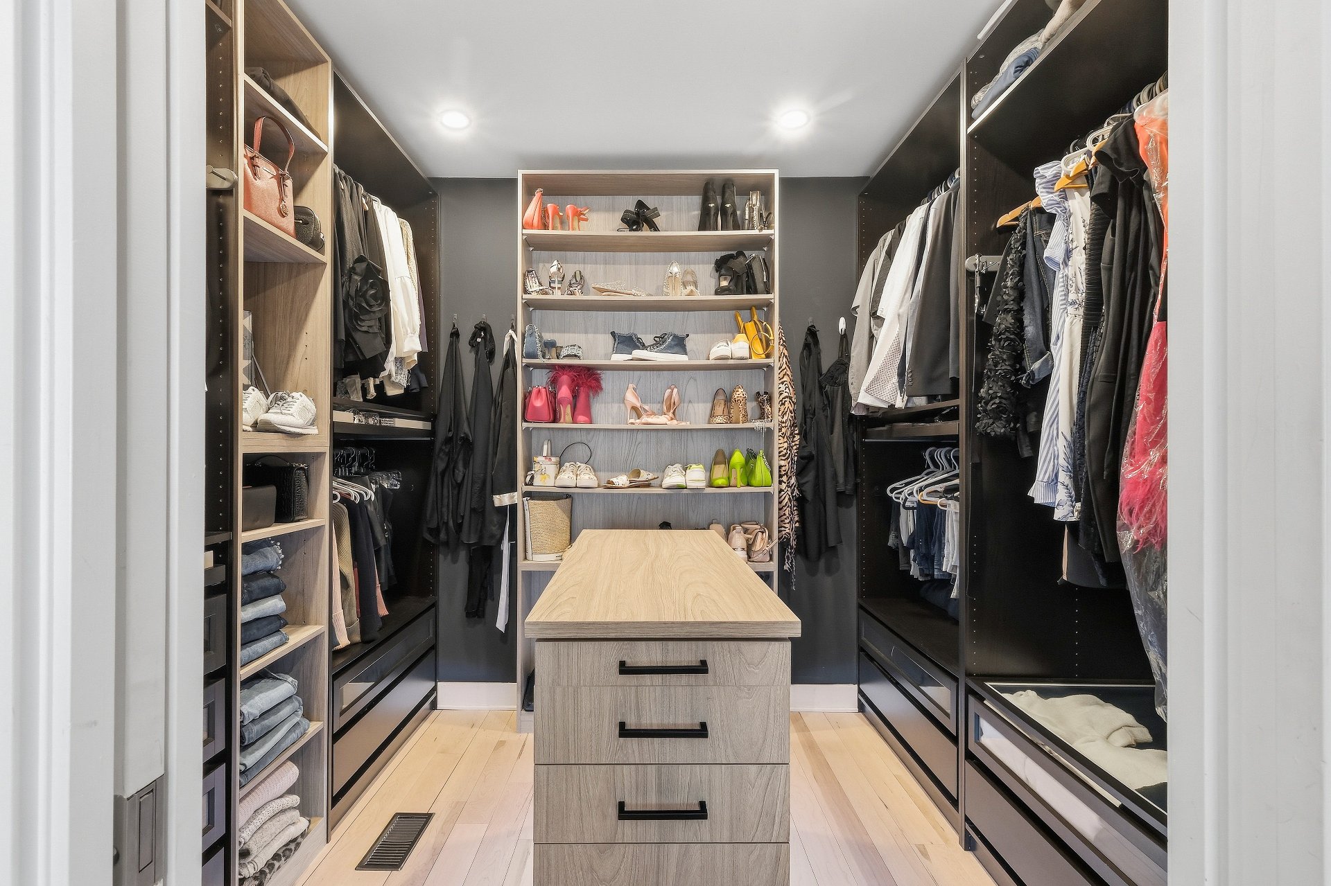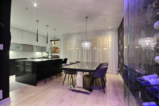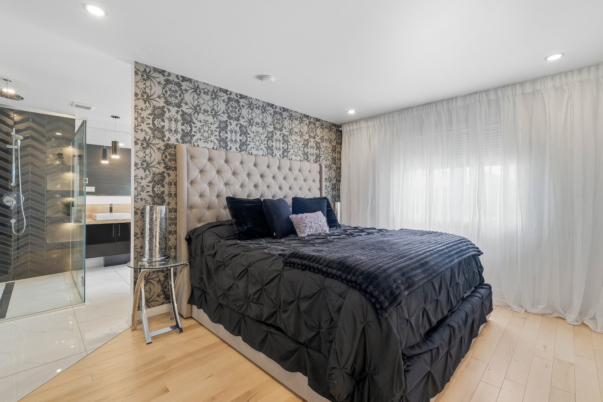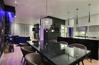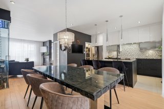 L'aire de vie principale propose un concept ouvert raffiné, agrémenté d'un cellier haut de gamme et d'une cuisine entièrement repensée. Celle-ci comprend un îlot en quartz de grande dimension ainsi qu'une cuisine secondaire discrètement aménagée, permettant de conserver un espace principal épuré tout en maximisant la fonctionnalité. Les rangements intégrés, incluant des espaces dissimulés, ont été conçus avec soin.
