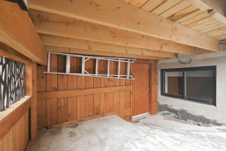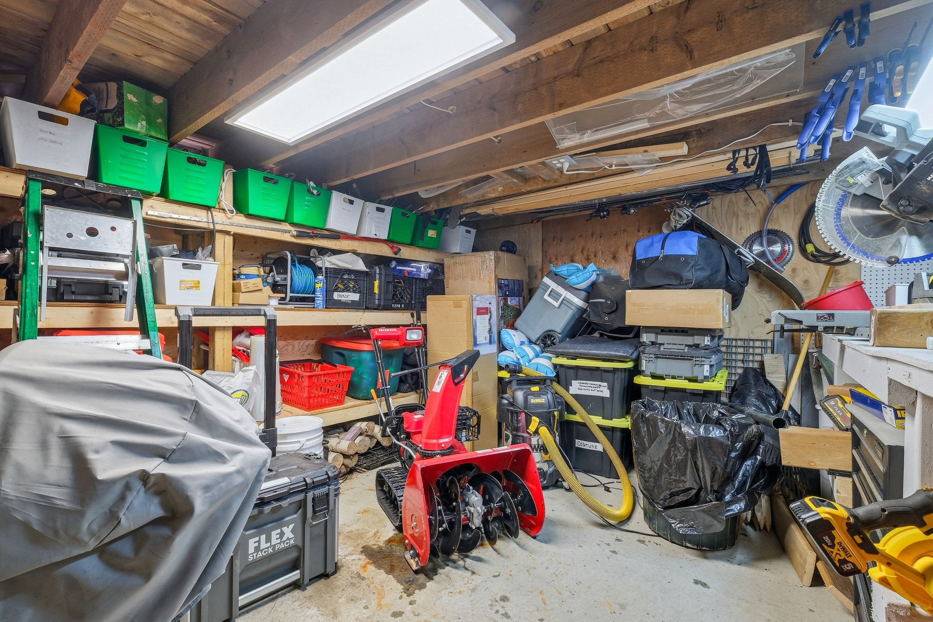 Sous la terrasse, un espace atelier construit en béton et en bois, conçu dès l'origine, offre une solution pratique et rare pour le rangement et la réalisation de projets, en plus d'un espace additionnel dissimulé.